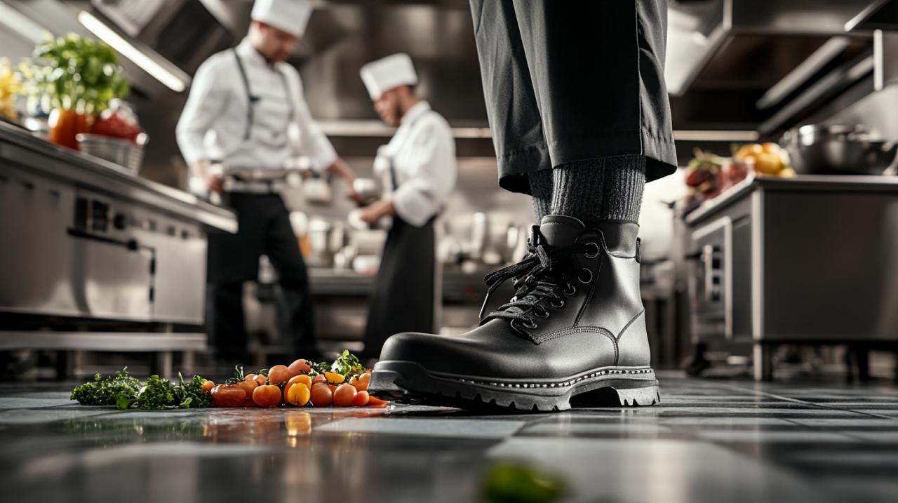 Dans une cuisine professionnelle, les sols deviennent rapidement glissants à cause des projections d'eau, d'huile ou de produits alimentaires. C'est pourquoi les semelles antidérapantes constituent un élément absolument crucial. Les certifications SRA et SRC testent l'adhérence des chaussures sur différents types de surfaces, respectivement sur sol céramique avec détergent et sur sol acier avec glycérine. Les chaussures arborant la norme SRC offrent la garantie de performances optimales dans ces deux conditions, réduisant considérablement les risques de chutes qui représentent l'une des principales causes d'accidents en restauration.